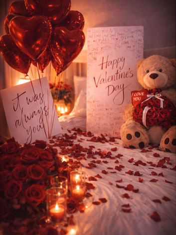 A deeply romantic suite-level transformation layered with roses, candlelight, and intentional detail. Experience Highlights: •10 dozen fresh rose arrangements styled in glass vases throughout the room •Fresh rose petals layered across the space for a romantic, immersive feel •A full ceiling installation of balloons, paired with floor balloons and 5 floating balloon columns •Soft candlelight throughout the room, styled with a mix of sand candles and floating candles •Plush Heart Pillows as a decorative accent •A curated food and beverage moment featuring Veuve Clicquot champagne, 2 champagne glassware, and a chocolate covered dessert charcuterie spread •A signature gift moment, including a large plush teddy bear, 3-tiered custom rose floral arrangement, and 2ftx4ft jumbo card •Professional delivery, complete setup prior to arrival, and next-day cleanup service Everything is designed, installed, and handled for you — so the experience feels seamless from start to finish • Full installation, styling, and next-day cleanup Every element is thoughtfully placed to create a moment that feels private, indulgent, and unforgettable. Investment $2,500
